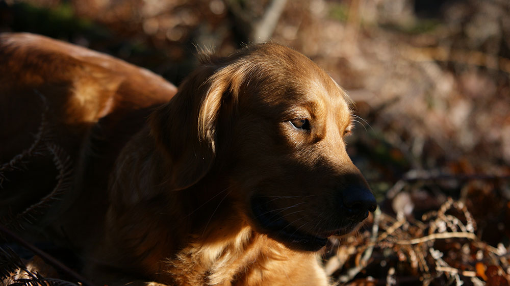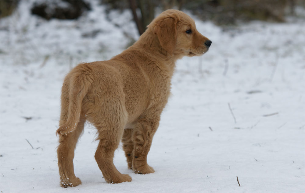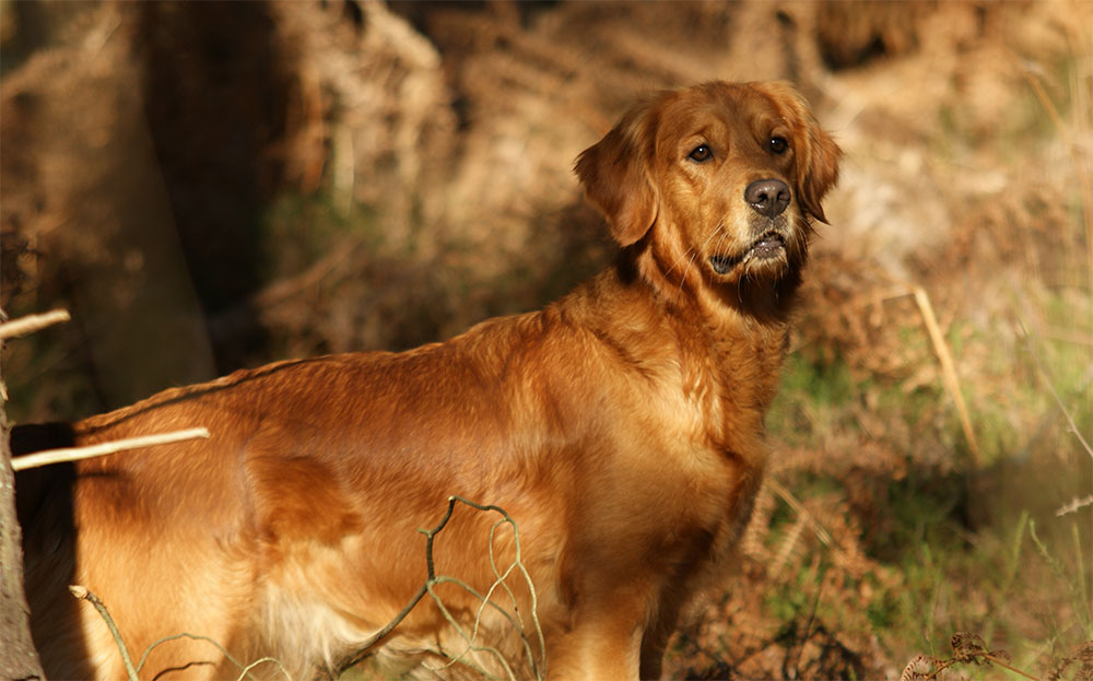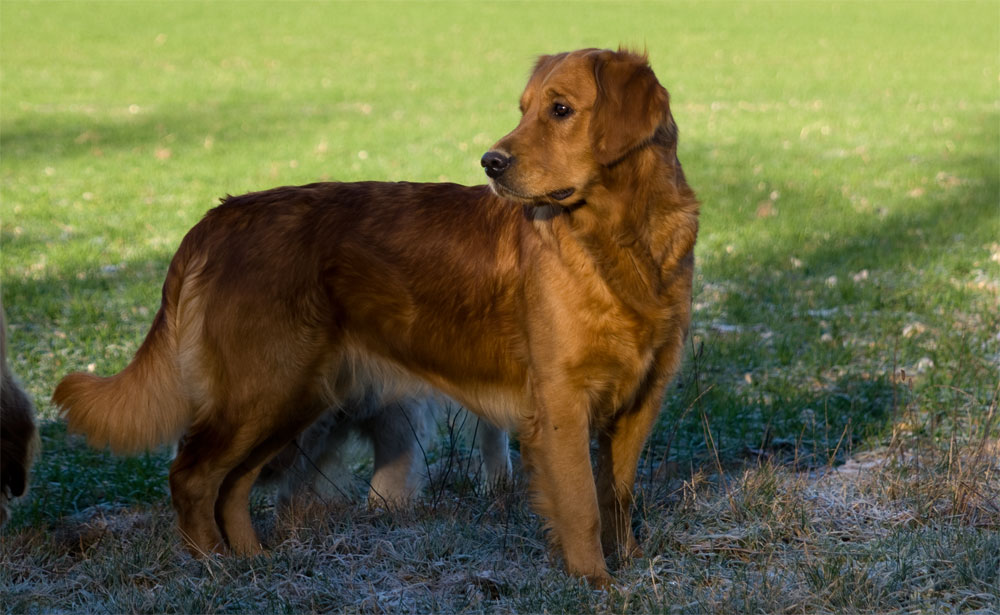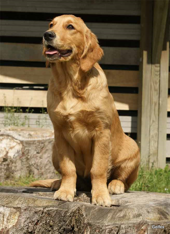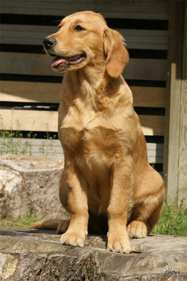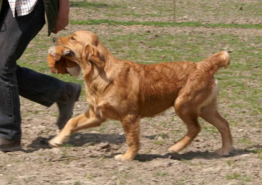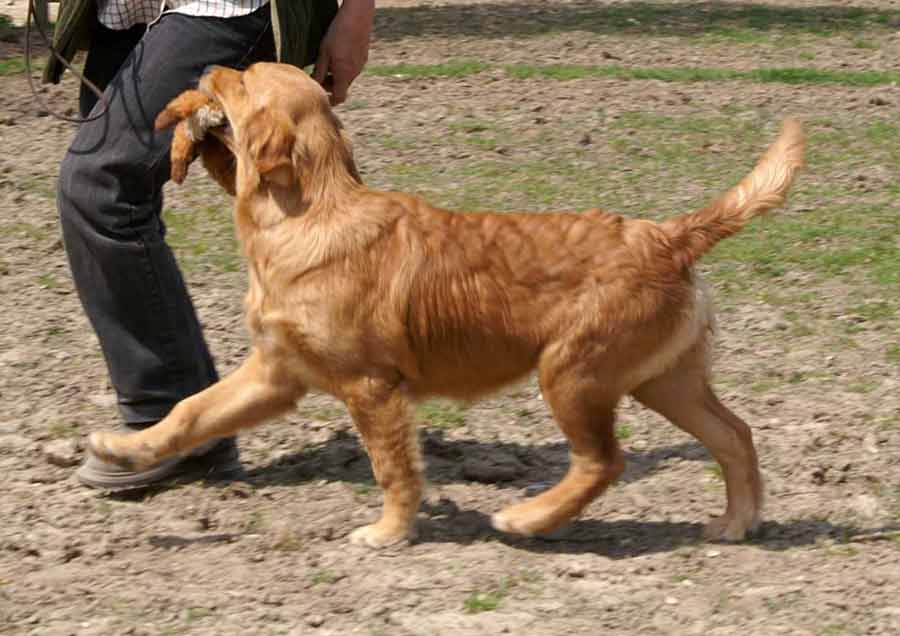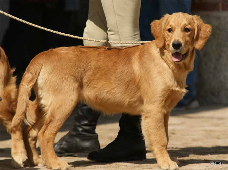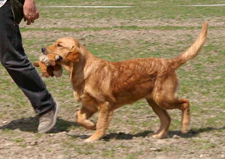 | Powerfull good size. Rich gold bitch. Mature body. Strong forelegs. Elegant length of legs. Excellent topline. Deep mature rib picture was spoilt a little with high flying tail in the move. |