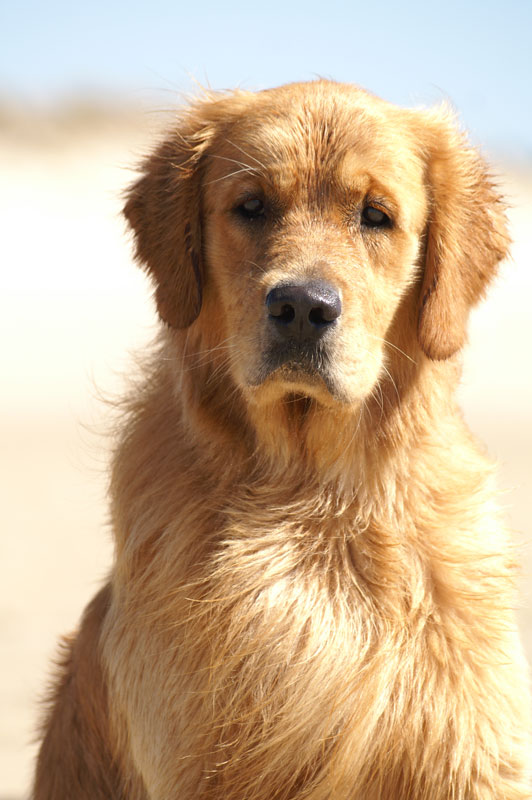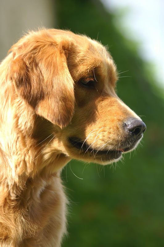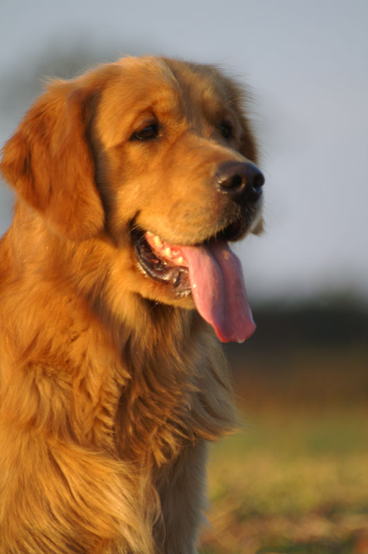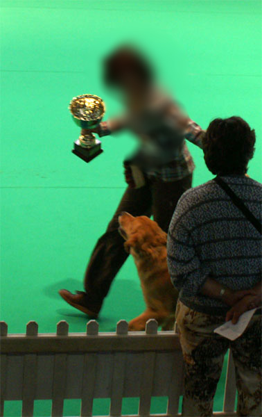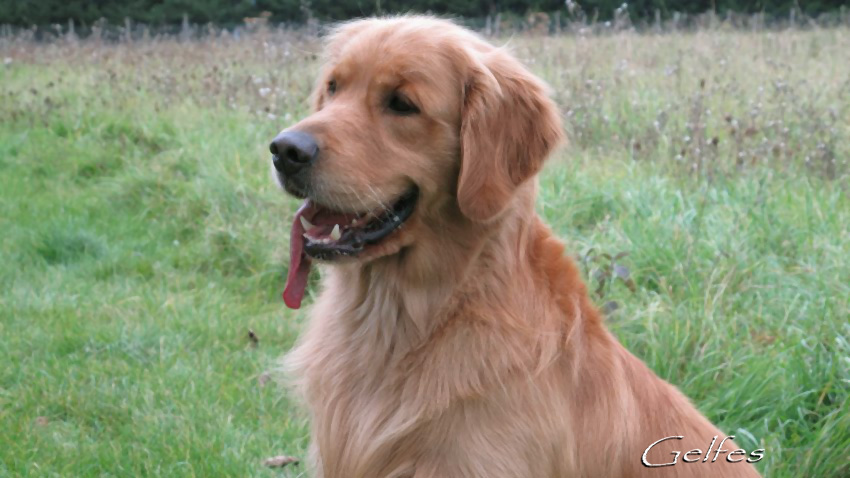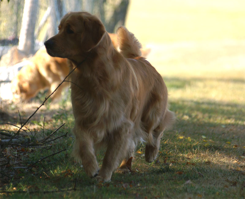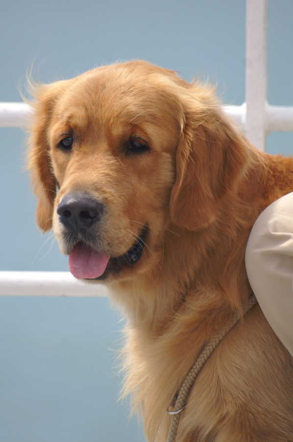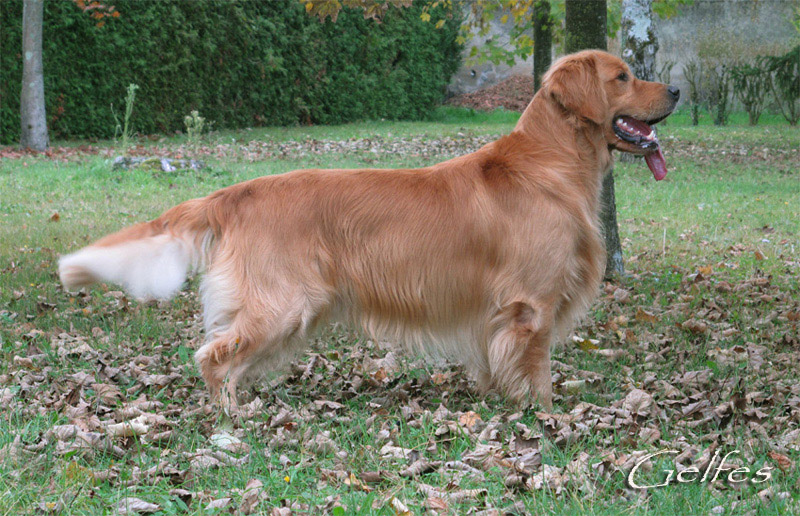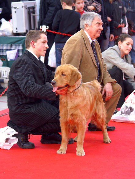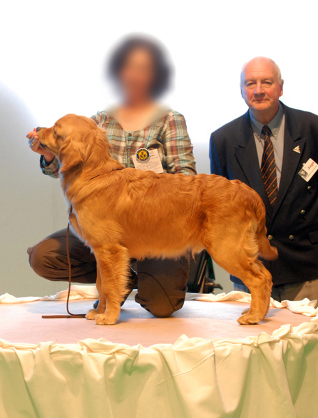 Rich gold quality dog. Well presented and handled, well proportionned through out Good level topline. Nice shapped dog eye - like lack of noze pigment does detract from his expression. Good broad thighs.