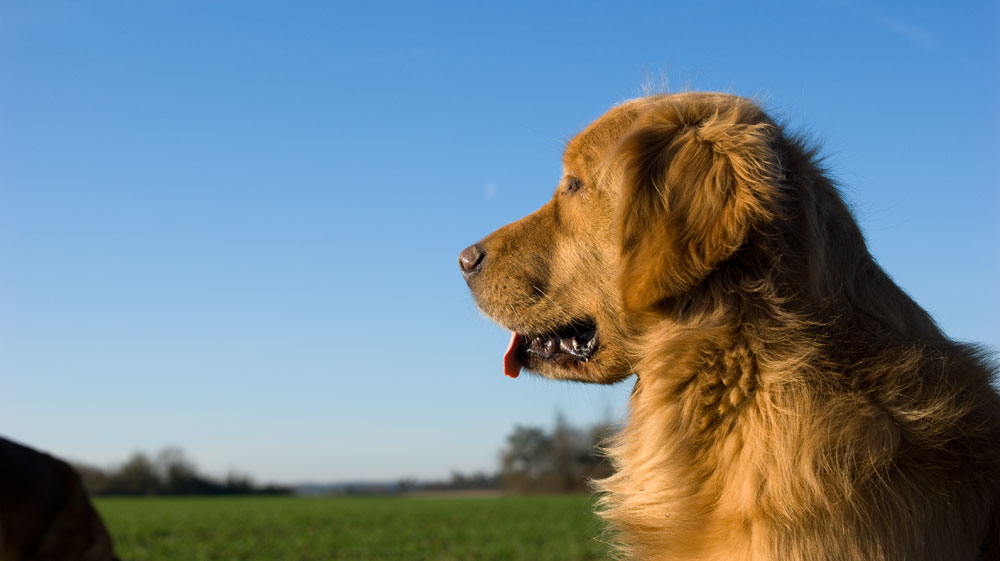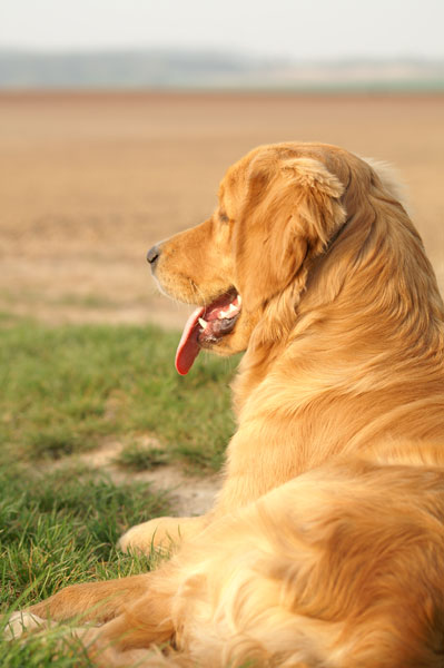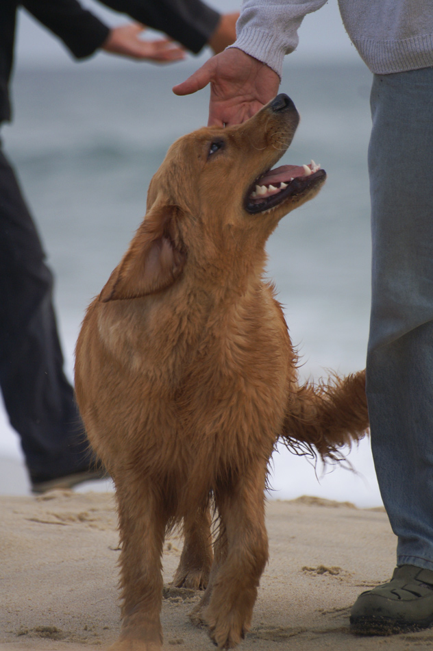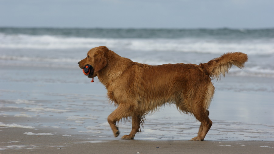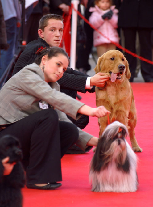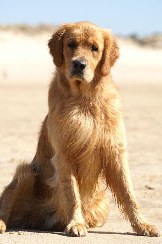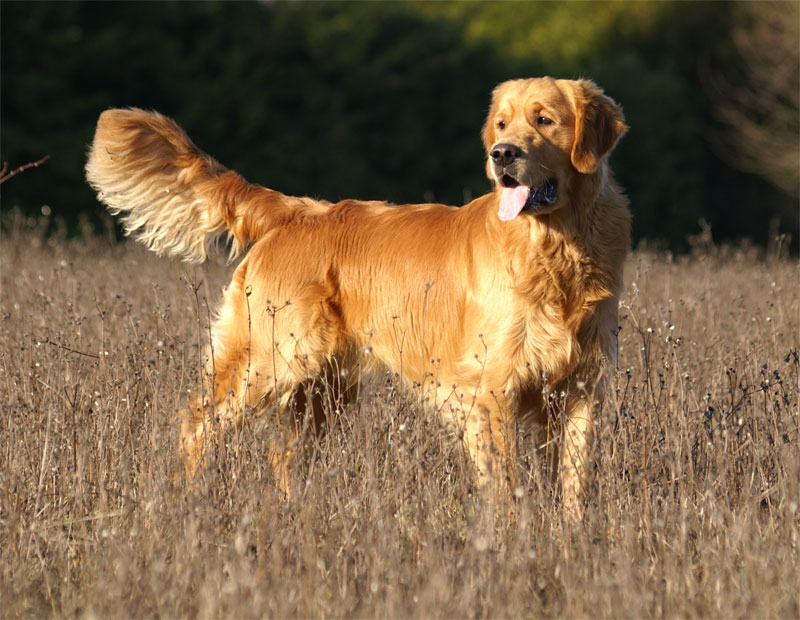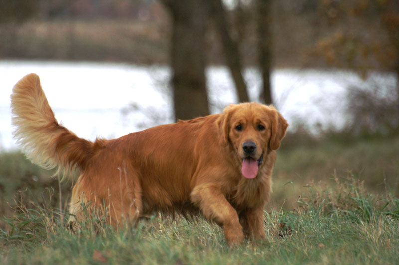 Rich gold quality dog. Well presented and handled, well proportionned through out Good level topline. Nice shapped dog eye - like lack of noze pigment does detract from his expression. Good broad thighs.