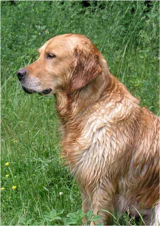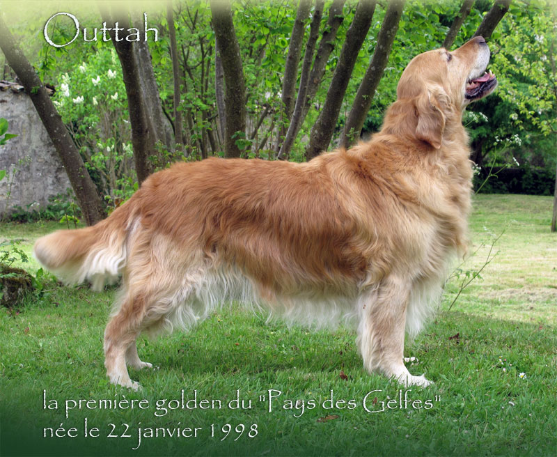 Outtah est née à la maison, à l'époque où notre seule ambition était de garder auprès de nous des goldens dont le caractère sûr, tendre et calme nous convenait parfaitement, sans songer à une sélection de champions. Puis, lorsqu'Urdaloup arriva dans la famille, les "Sauvages" de Gaëlle Aubac confirmant tout ce que nous espérions de nos goldens, Tamak et Outtah donnèrent naissance à la première lignée des Gelfes, le 23 avril 2004. Ayant eu cette portée, elle révéla un vrai caractère de golden de chasse, et nous mit au travail... Elle passa son sélectif A puis son B moins d'un an après sa "révélation". Elle continue de rapporter dummy et gibiers avec une énergie et un amour débordant. Notre seul regret est de ne pas avoir eu le temps, plus rapidement, de profiter de ses dispositions naturelles, qu'elle a su transmettre sans aucun doute à sa fille Vamakko.