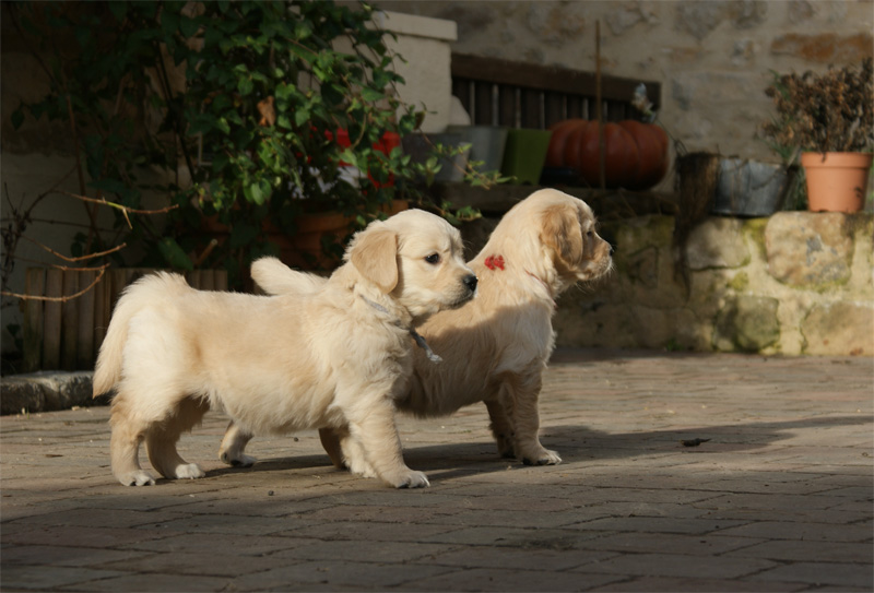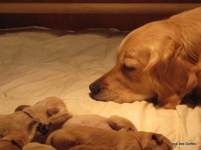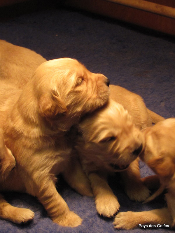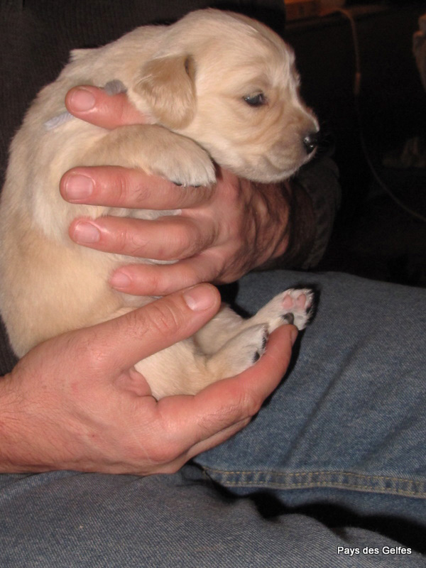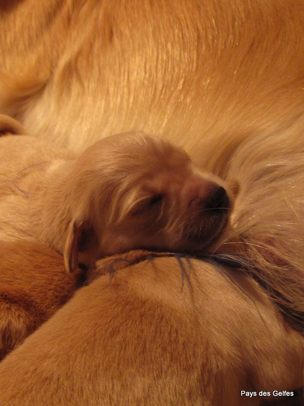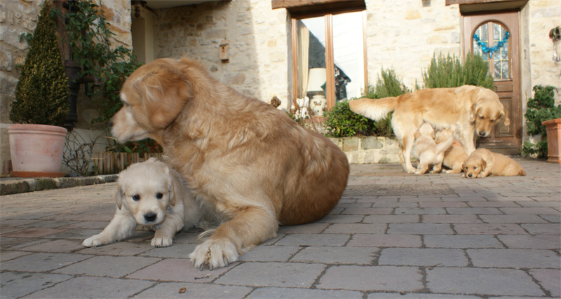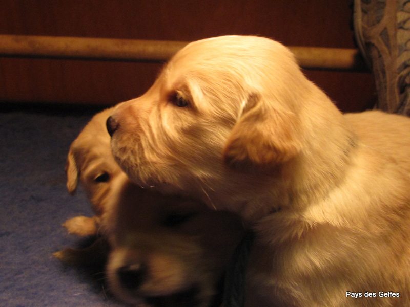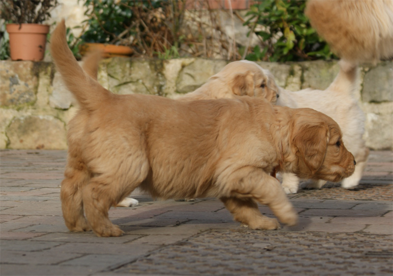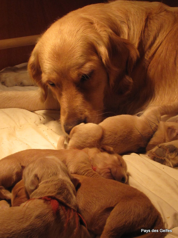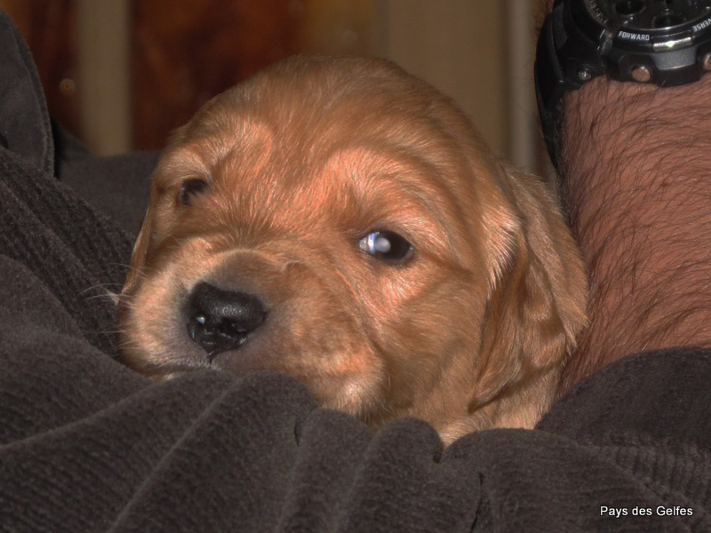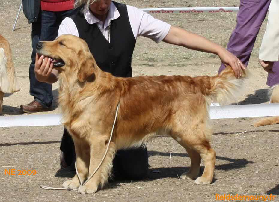 Merci, Jean, pour l'immense confiance que tu nous fais en nous confiant Nousch ! Les petits sont attendus pour la fin novembre. Le Papa fait partie de l'équipe des Fields de Mauny désormais, magnifique jeune golden fauve orangé, il a pour père Vaillant des Fields de Mauny, et pour mère Acouna des Mystères de l'Ouest. Joyeux et très équilibré, il a été remarqué à la nartionale d'élevage de Sully sur Loire en septembre 2009, récompensé par une première place excellente classe Jeune.