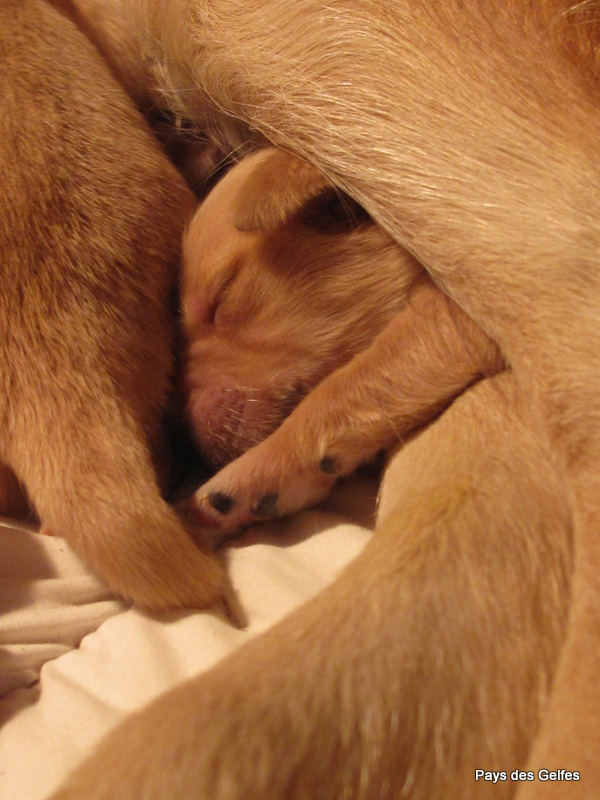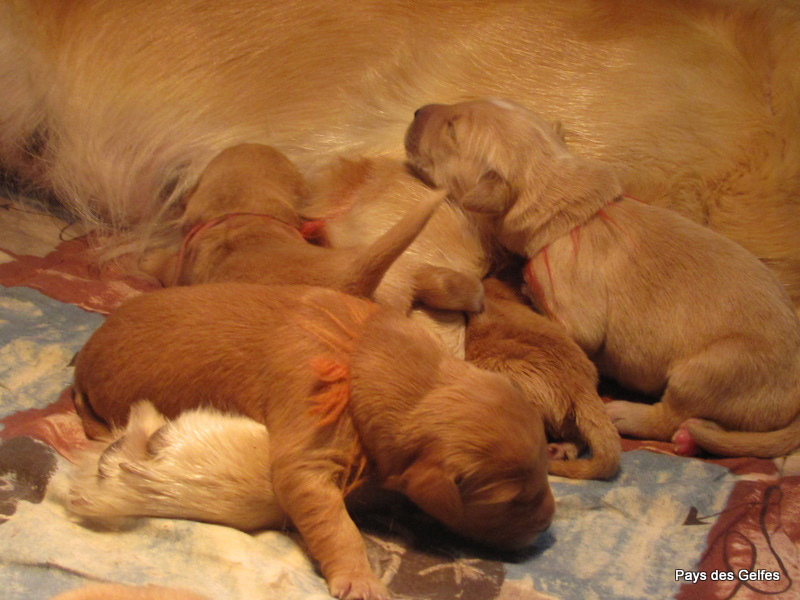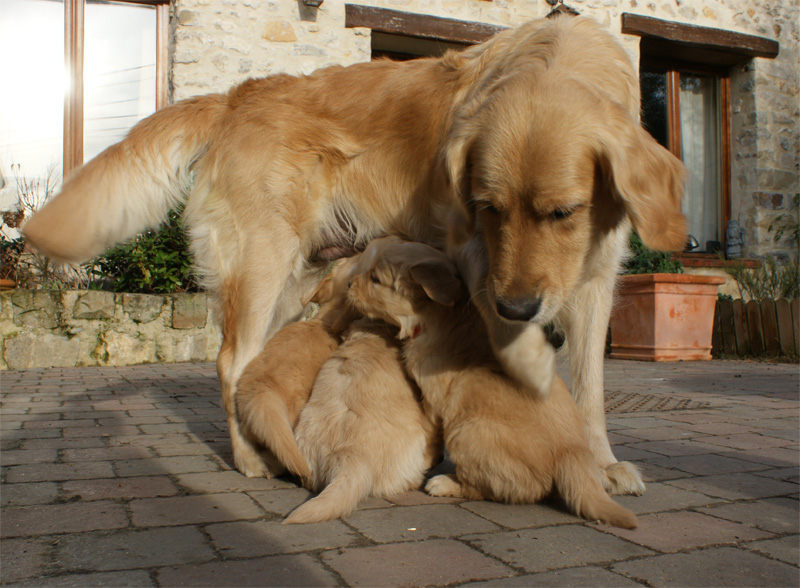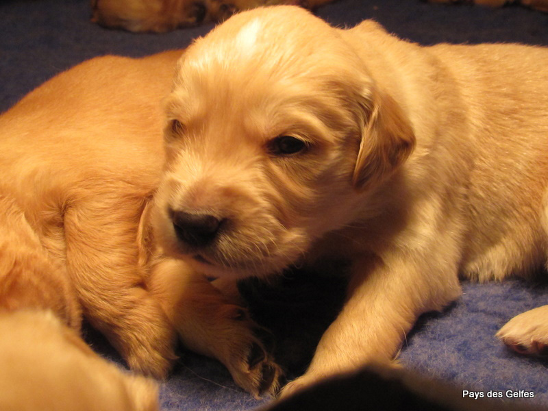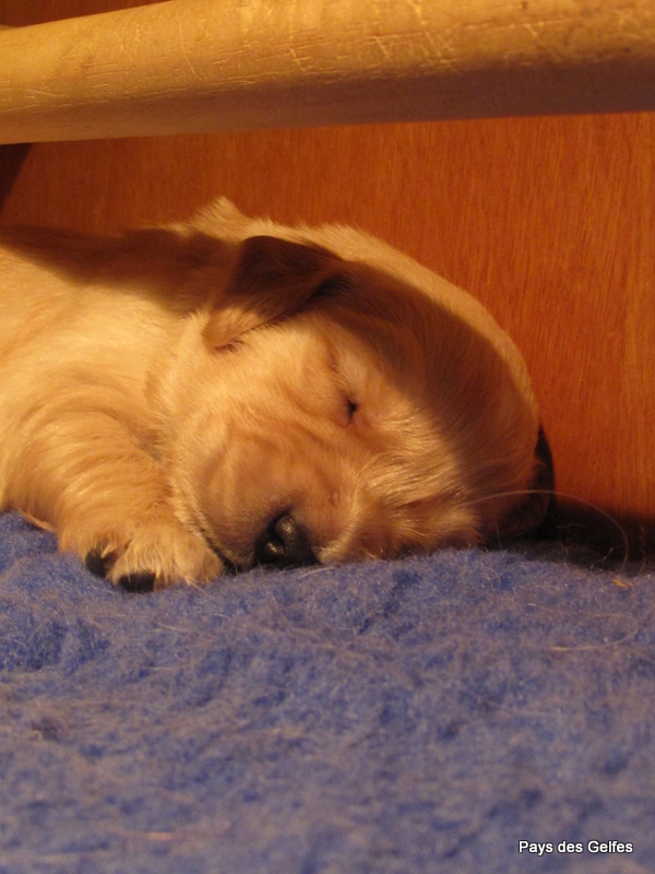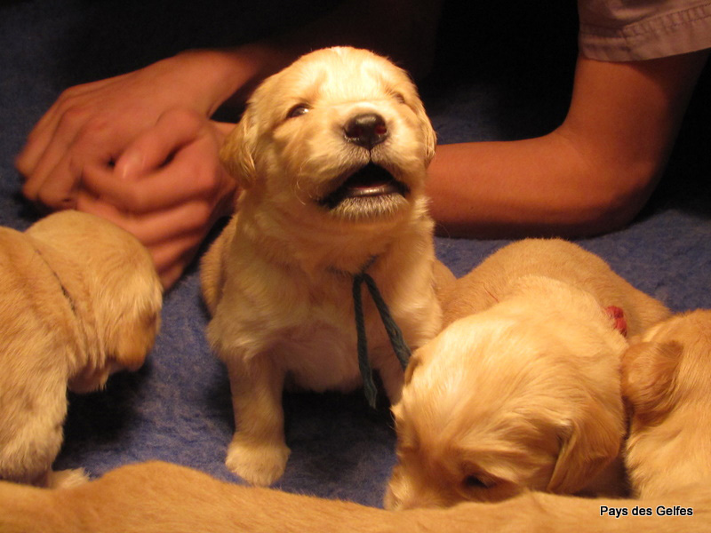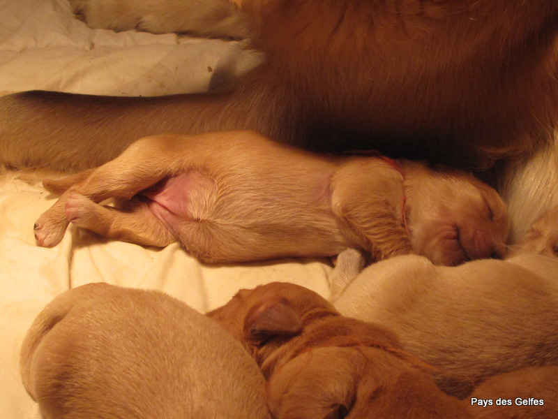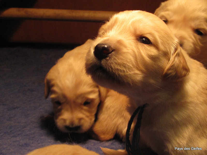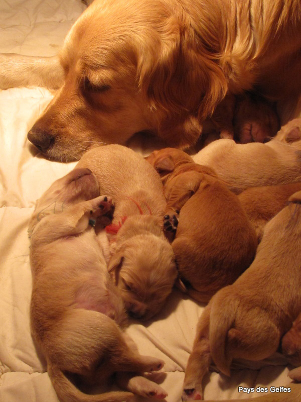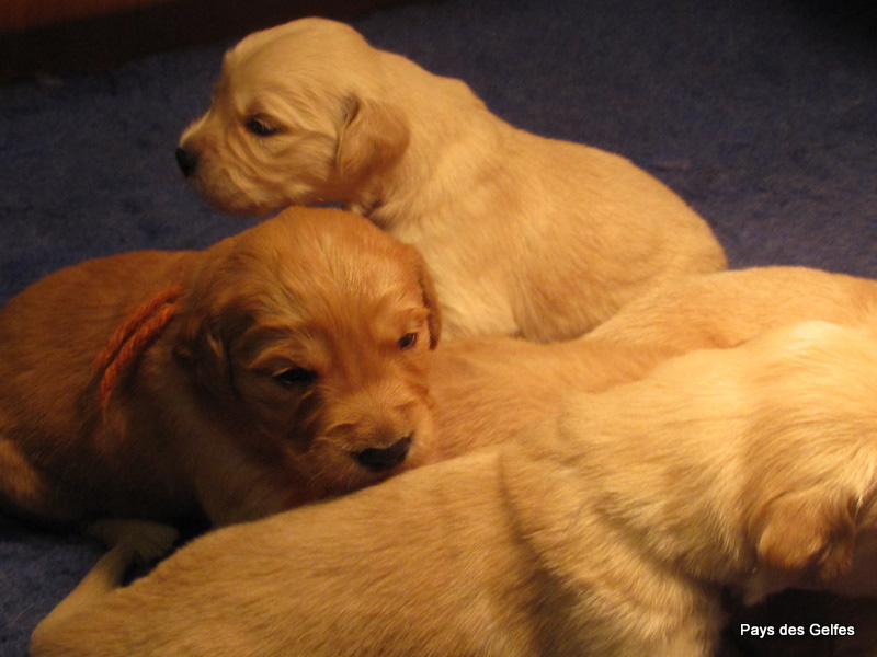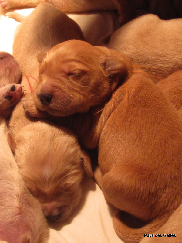 Merci, Jean, pour l'immense confiance que tu nous fais en nous confiant Nousch ! Les petits sont attendus pour la fin novembre. Le Papa fait partie de l'équipe des Fields de Mauny désormais, magnifique jeune golden fauve orangé, il a pour père Vaillant des Fields de Mauny, et pour mère Acouna des Mystères de l'Ouest. Joyeux et très équilibré, il a été remarqué à la nartionale d'élevage de Sully sur Loire en septembre 2009, récompensé par une première place excellente classe Jeune.