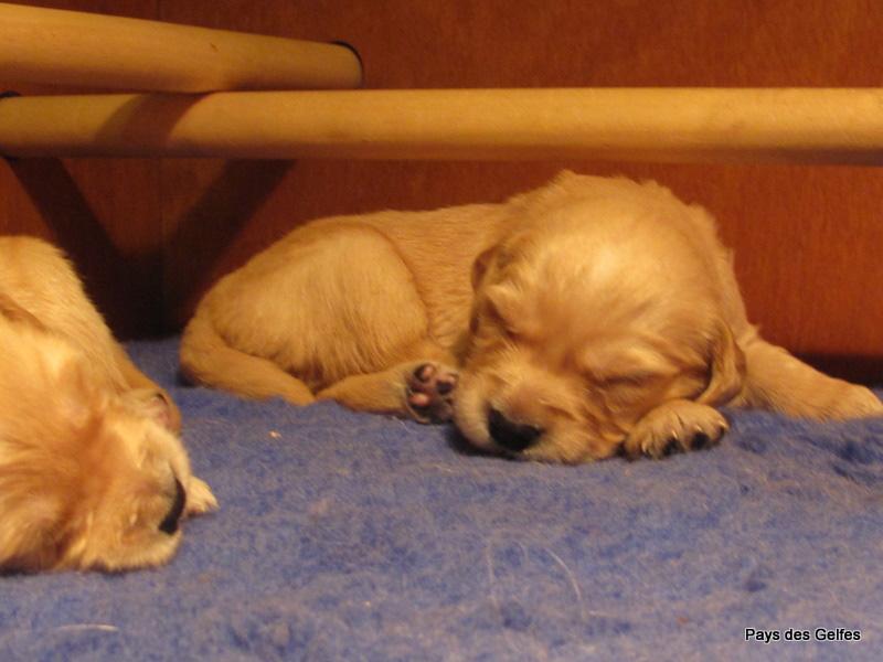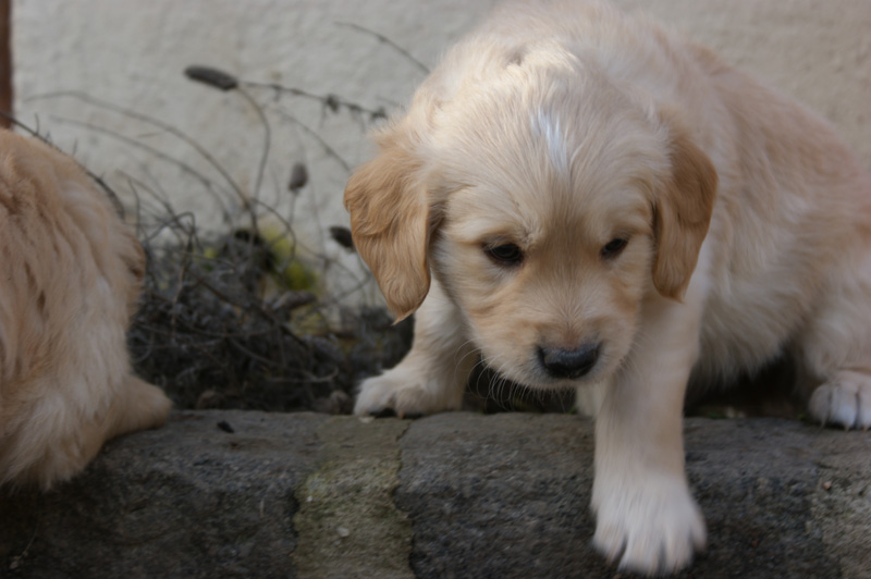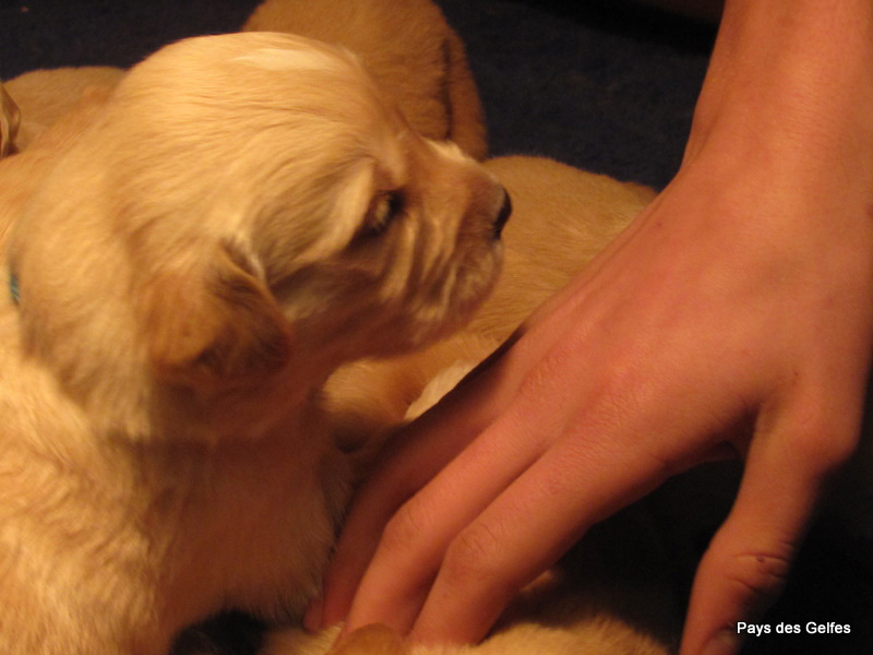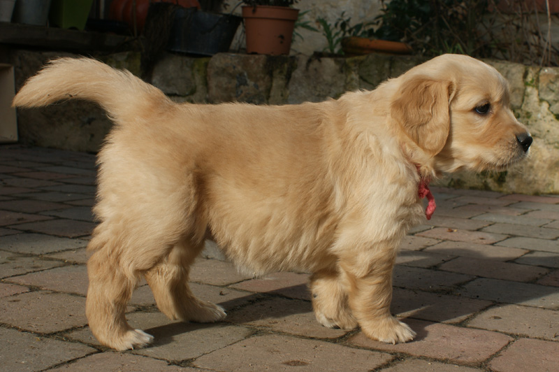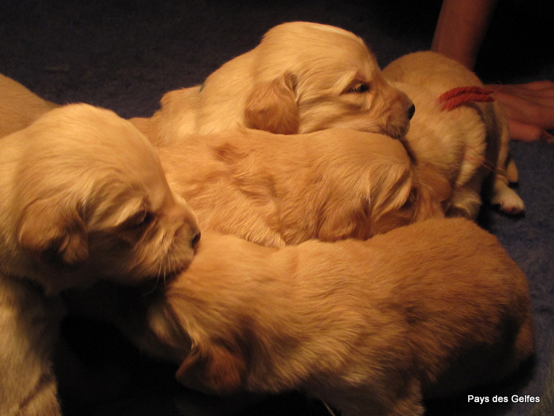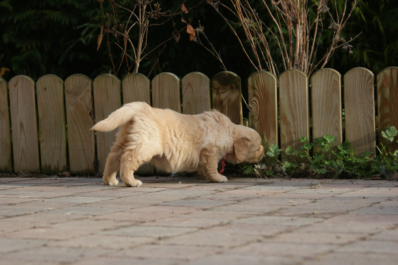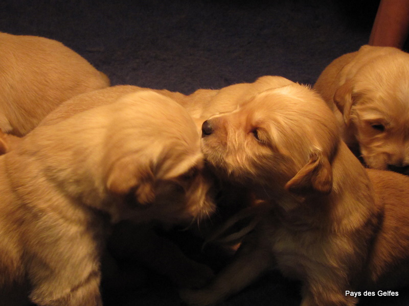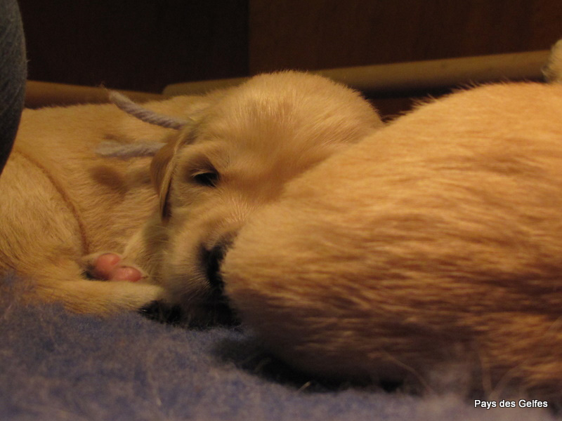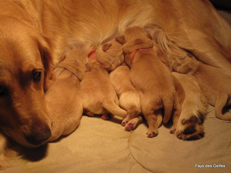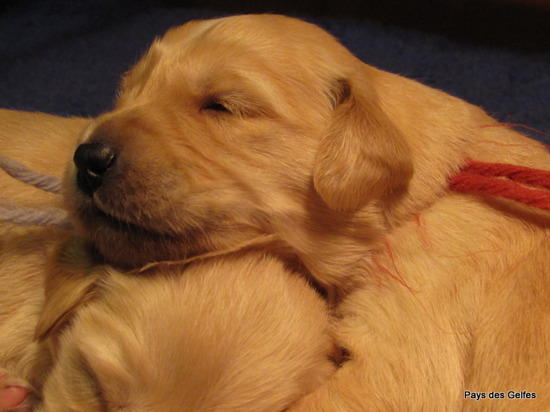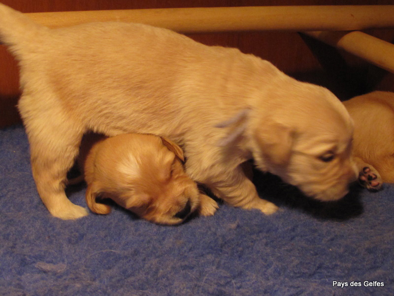Merci, Jean, pour l'immense confiance que tu nous fais en nous confiant Nousch ! Les petits sont attendus pour la fin novembre. Le Papa fait partie de l'équipe des Fields de Mauny désormais, magnifique jeune golden fauve orangé, il a pour père Vaillant des Fields de Mauny, et pour mère Acouna des Mystères de l'Ouest. Joyeux et très équilibré, il a été remarqué à la nartionale d'élevage de Sully sur Loire en septembre 2009, récompensé par une première place excellente classe Jeune.