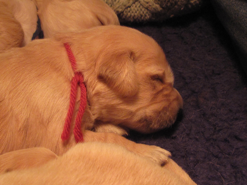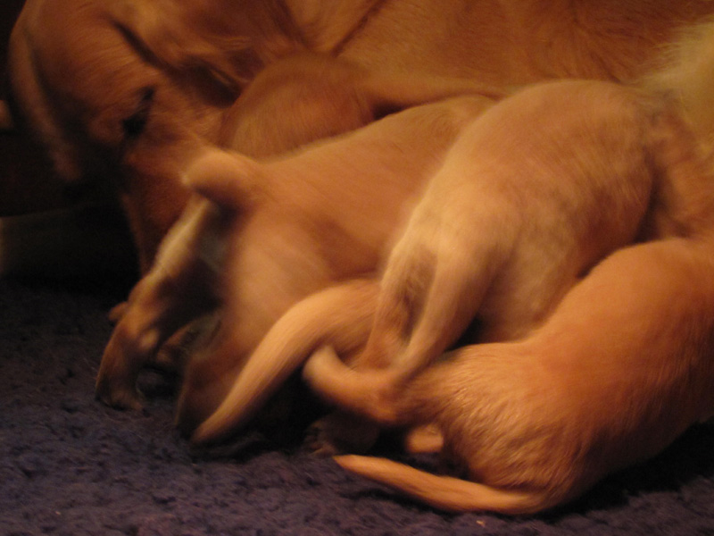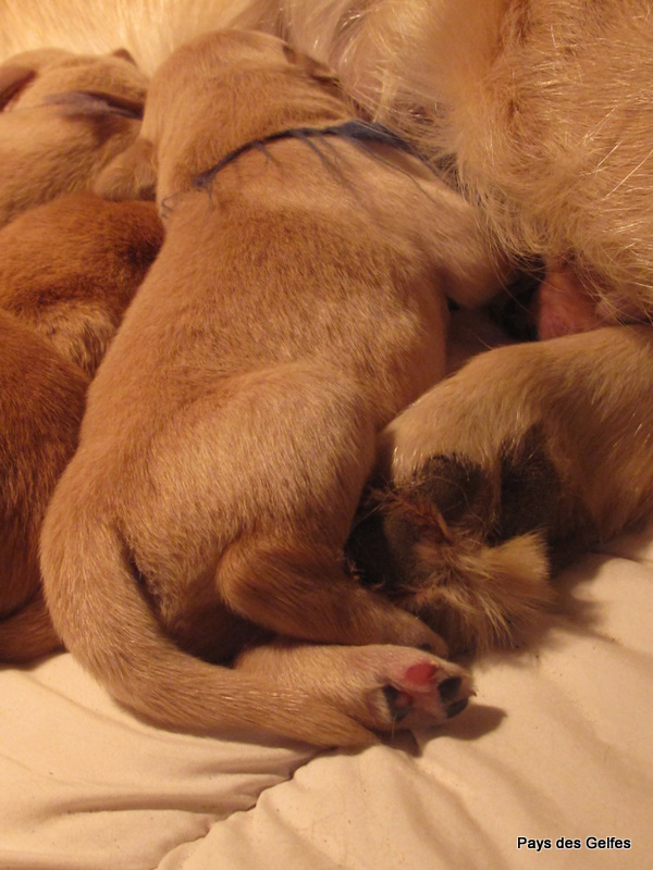 Les yeux se sont ouverts pour tous à douze jours, les petites pattes se dressent bien énergiquement, et la ruée pour les tétées est de plus en plus énergique