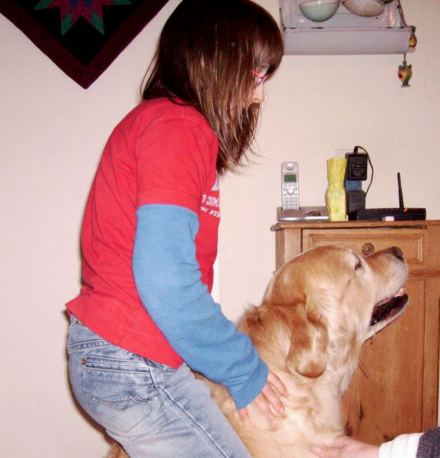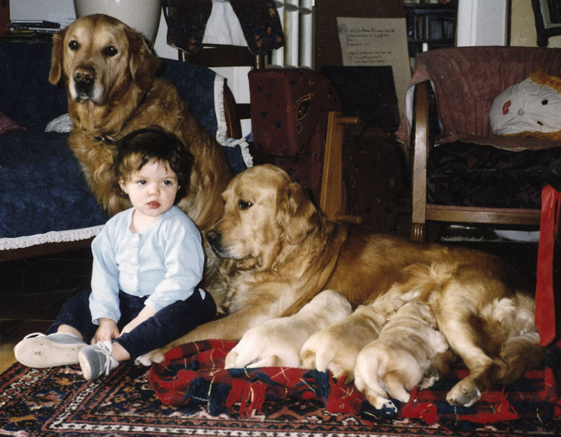 Ferguson, Léo, Juni et sa première portée en février 1998 Nous avons pu constater que notre enfant, accompagnée depuis sa plus tendre enfance par nos braves Ferguson et Juni, puis toute la meute jusqu'à la petite Dew, puis Wen, sortait moins difficilement que d'autres enfants de situations d'angoisse, et accomplissait des progrès lui permettant d'être maintenue en secteur scolaire ordinaire, ce qui, pour nous, est extra-ordinaire... Cet accompagnement aura de manière très certaine permis à l'enfant de grandir de manière différente, comme si nos chiens, par l'effet de leur bonté naturelle, avaient établi un lien supplémentaire entre elle, si loin et en souffrance, et nous qui ne comprenions pas tous ses messages. Nous soutenons depuis notre arrivée en Seine et Marne en 2007 l'association TEDI77 qui nous aura aidé à intégrer l'enfant au collège public dont nous dépendons géographiquement. Cette association entre monde ordinaire, amitié avec des parents dans la même difficulté, et meute de golden tranquilles a certainement été un facteur d'équilibre rare, et de réussite.